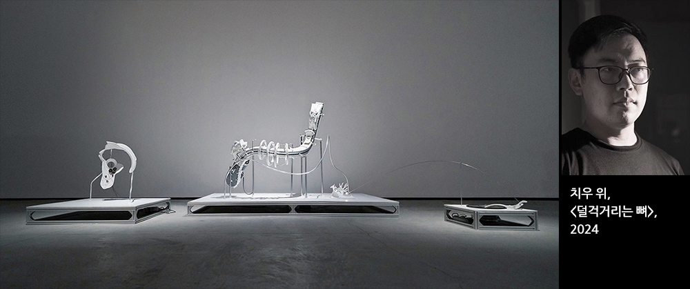 치우 위의 <덜걱거리는 뼈Rattling in the Bones>2024는 기계적 운동 구조와 자연적 요소를 결합해 인간·기계·자연의 관계를 탐구하는 설치 작품이다. 작가는 3D 프린트 재료와 금속·광물을 조합해 생명 리듬을 지닌 듯한 유기적 구조를 구축하며, 차가운 기계와 원초적 물질의 마찰을 통해 생명의 기원과 그 미래를 은유한다. 관객은 기계의 리듬과 자연의 맥박이 교차하는 감각을 경험하며, 기술과 자연의 새로운 균형과 공생 가능성을 사유하게 된다.