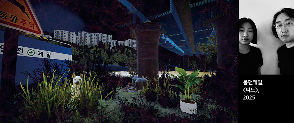 룹앤테일의 <피드Feed>2025는 도심 경계 공간에 존재하는 비인간 행위자들의 보이지 않는 리듬을 감각하는 비디오게임이다. 아파트 단지와 고가도로로 둘러싸인 하천가에서 밤이 되면 낮 동안 보이지 않던 존재들이 드나들고, 플레이어는 이들이 남긴 흔적을 따라가며 다중의 시점으로 재구성된 장소의 기록을 마주한다. 제목의 ‘feed’는 ‘먹이다’라는 동사이자 데이터를 갱신하는 메커니즘을 의미한다. 무너진 전광판에 흩어진 장면들은 인간과 비인간이 함께 생성하는 피드feed로, 시뮬레이션 속 보이지 않는 연결망을 드러낸다. 인간의 개입이 사라진 자리에서 또 다른 존재들의 리듬이 조용히 이어지며 세계를 갱신한다.