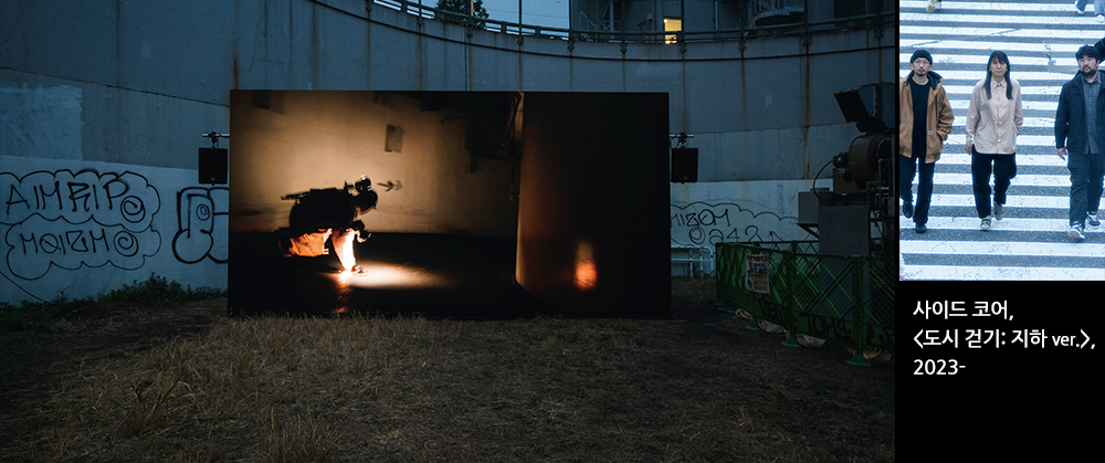 사이드 코어의 <도시 걷기: 지하 ver.rode work ver. under city>2023- 는 <rode work>2017- 시리즈의 연장선에 놓인 신작으로, 접근이 어려운 지하 조정지와 폐역 등에서 촬영한 스케이터들의 활주를 통해 ‘도시의 지하 공간’을 탐구한다. 서로 다른 장소의 영상을 연결해 가상의 지하 도시를 구성하며, 지질학·방재·도시론 등 다양한 관점을 교차해 도쿄의 지층을 드러낸다. 이번 작품에는 스케이터 모리타 다카히로가 퍼포머이자 디렉터로 참여했다. 스케이트보드를 매개로 도시와 인간의 관계를 재해석하며, 변화하는 지하 공간의 미지성과 상상력을 환기한다.