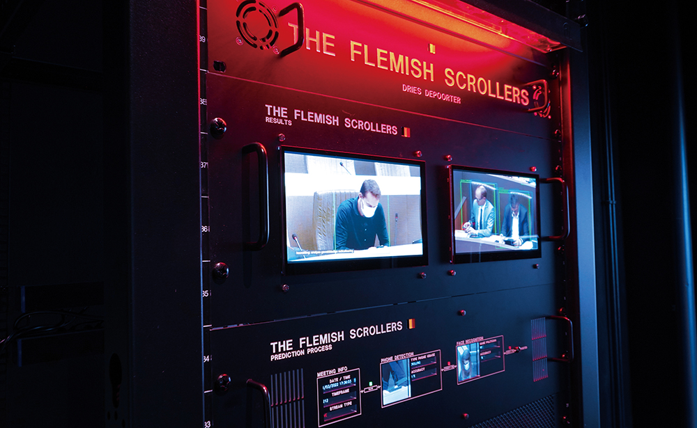 드리즈 더포르터, <플랑드르의 스크롤러>, 2021, 인터랙티브 설치, 서버 랙, 스크린, 서버, 4대의 라즈베리 파이, 197×60.4×100cm