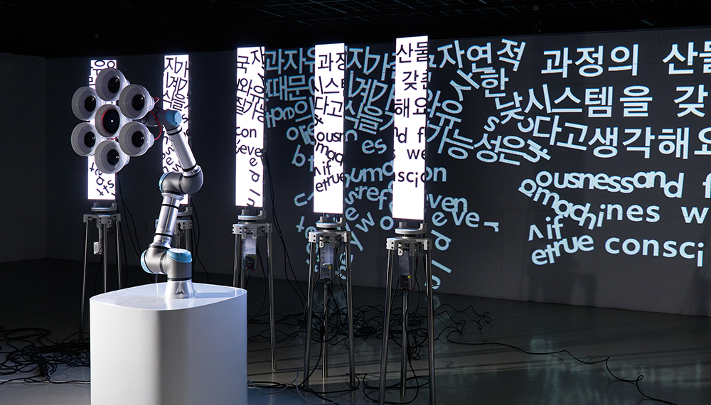 양민하, <미상의 사유>, 2025, 인공지능 로봇 및 비디오 설치, 인공지능, 컴퓨터, 소프트웨어, 프로젝터, 가변 크기, 후원 유니버설로봇