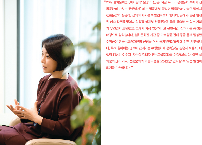 초창기에는 전통을 있는 그대로, 장인정신을 고스란히 보여주려고 노력을 많이 했습니다. 그러다 보니 전시가 특정 소수에 국한되고, 더 많은 이들에게 대중화하는 데 한계를 느꼈습니다. 5년 전부터 전시의 방향을 바꿔 장인들의 작품만 보여주는 방식이 아니라 현대적으로 재해석해 전통문화가 얼마나 아름답고 가치 있는 것인지를 느낄 수 있도록 전통과 현대의 적절한 조화를 추구하고 있습니다. 앞으로 기성세대뿐만 아니라 밀레니얼 세대도 전통문화에 관심을 가지고 그 아름다움을 체험할 수 있는 전시를 기획하는 것이 목표입니다.