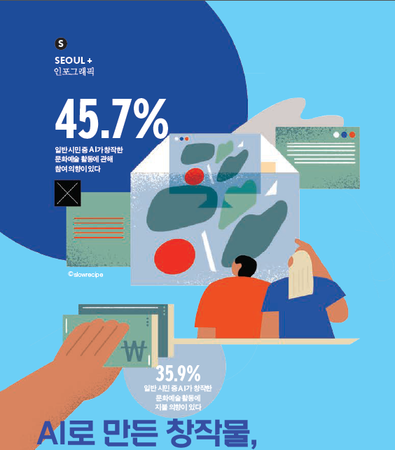 서울시에 거주하는 만 15세 이상 일반 시민 10명 중 5명(45.7%)이 앞으로 AI 창작물의 공연이나 전시·행사가 열린다면 그러한 문화예술 활동에 참여할 의향이 있다고 답했다. 직종별로 보자면 학생(48.8%)이 다른 직업에 비해 상대적으로 높게 나타났으며, 경제적 계층이 높을수록 긍정적인 의사를 보였다. 다만 그러한 문화예술 활동에 돈을 지불할 의향에 관해서는 의견이 첨예하게 나뉘는 것으로 보인다. 지불 의향이 있는 응답자는 35.9%, 지불 의향이 없는 응답자는 32.9%로 나타났다. 시대 변화에 따른 현상에 대체로 긍정하지만, AI 창작물에 대해 뚜렷한 선호도가 드러나지는 않는 것.