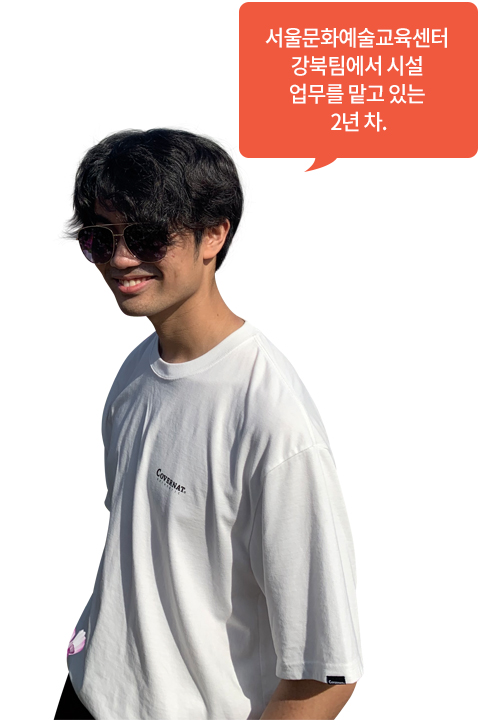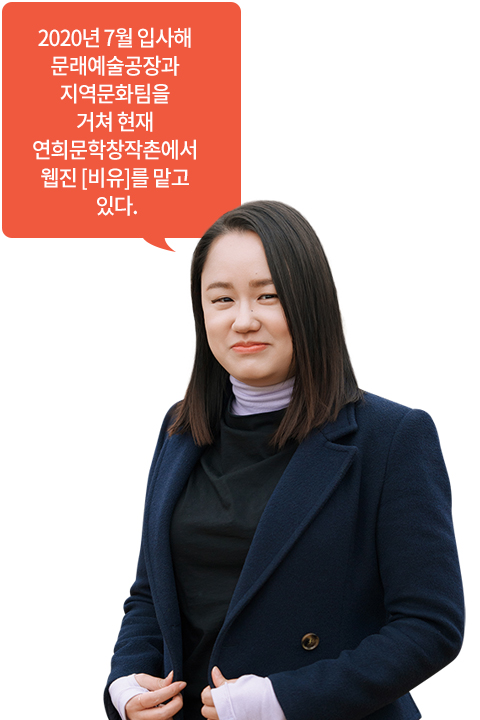 제가 재단에 입사한 결정적 이유가 ‘사람’이었습니다. 임시직(행정스태프)으로 일하며 서울문화재단에 다니는 사람들은 어떤 생각을 하고 어떻게 일하는지 바로 옆에서 볼 수 있었고, 각자가 가진 사명감과 책임 의식을 느낄 수 있었습니다. 제게 부족한 점을 배울 수 있는 사람들이 있었고, 힘들 때도 계속 일할 수 있도록 응원과 지지를 보내준 것 또한 함께 일하는 동료들이었습니다. 앞으로도 상하 지위 막론하고 서로 배움을 주고받는 공동체가 되면 좋겠습니다!