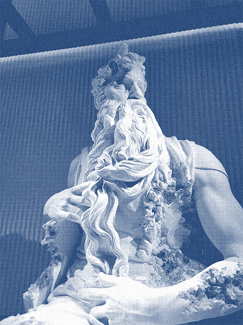 이 ‘모세상’의 원본은 르네상스의 거장 미켈란젤로가 교황 율리우스 2세의 유언에 따라 묘당을 꾸미기 위해 1513년부터 제작해 로마 산 피에트로 인 빈콜리 성당의 조각이다. ‘피에타’, ‘다비드’와 함께 미켈란젤로의 3대 조각으로 꼽힌다. 십계명이 적힌 석판을 들고 마을로 돌아온 모세가 금송아지를 놓고 우상숭배하는 모습에 분노하는 장면을 포착했다. 모세의 정수리 쪽에 뿔이 솟아 있는데, 히브리어의 기록을 ‘뿔’이라 번역하는 이도 있고 ‘빛’이라 번역하는 경우도 있다. 어쨌거나 그 솟아난 영험함이 모세를 신성한 존재로 부각한다.