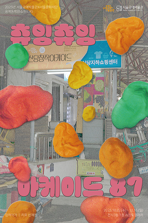 서울문화재단 신당창작아케이드와 서울공예박물관이 협력해 진행하는 ‘공예동행@쇼윈도’ 다섯 번째 전시로 김리호·신예원 작가가 협력한 《츄잉츄잉 아케이드 87》이 열린다. 컨셉추얼 디자인을 선보이고 있는 김리호와 산업 재료의 공예·조형적 가능성을 실험하는 아트 퍼니처를 선보이는 신예원 두 사람이 함께 선보일 작품이 기대된다.
